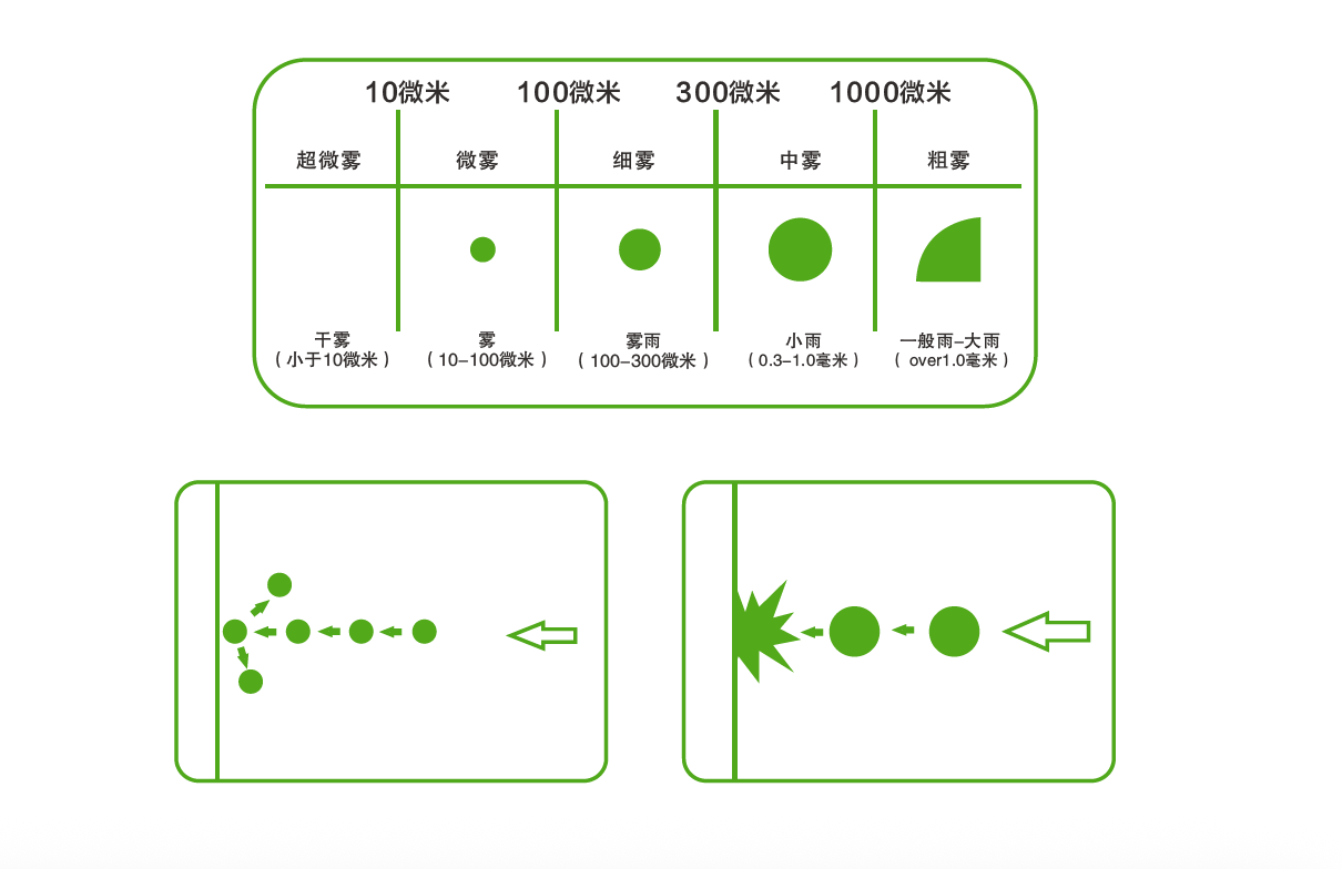 干雾有如下的性质1、干雾滴不会沉降并且进行无规则运动(布朗运动原理);2、干雾滴不会聚合在一起产生大的液滴;3、干雾滴在物体表面接触后会反弹,而不会破裂从而湿润表面;4、基于这些性质,冷干雾气体即便在难以达到的地方也有很好的表面接触效果。