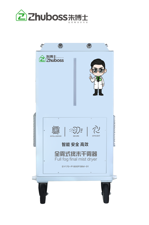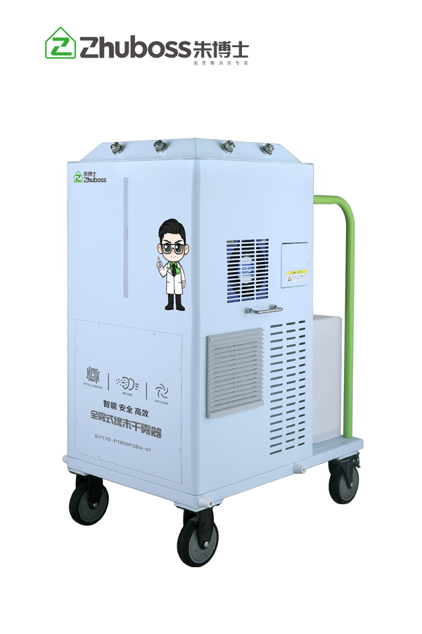 朱博士全雾式终末干雾器通过向需要消毒的区域扩散冷干雾来完成喷雾消毒过程。当液滴的平均直径小于10μm时,喷出雾可以被看作是“干”的;小的液滴会从物体表面上弹开并且不会破裂、附着使表面潮湿。消毒剂、除臭剂以冷干雾的形式有效地移动到指定的区域。这种形式的干雾,其特性决定了它们可以移动到平时难以达到的区域。